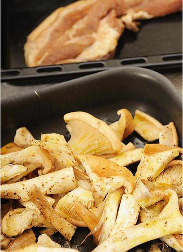 做法很简单,将洗好的蘑菇切开,拌入香草盐与橄榄油抓匀,烤箱以摄氏180度预热好,放入烘烤15分钟即可。(照片后方是我同时加烤的客家咸猪肉,一次解决两道菜。)