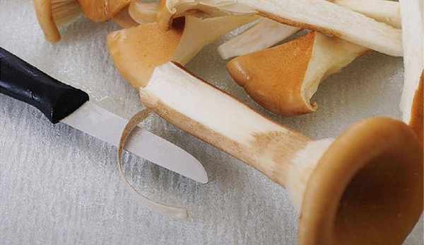 Step1.蘑菇洗干净后用小刀剥下茎的外皮,因为它有点韧,不撕下来的话咬不断。