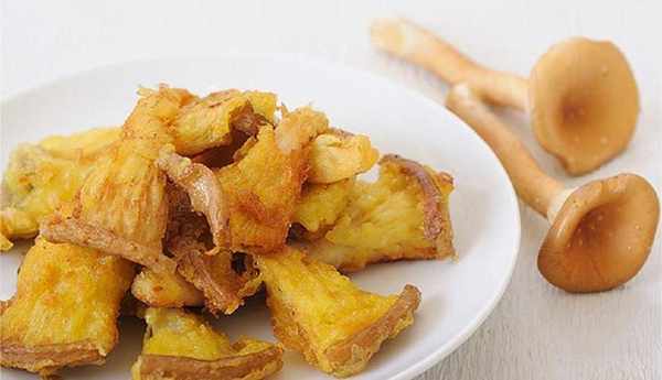 说明:因为菇类外表光滑,不容易沾附面糊,所以先打上薄薄的一层粉,使表面凹凸。