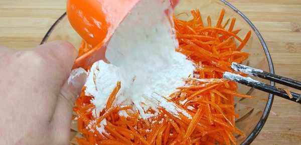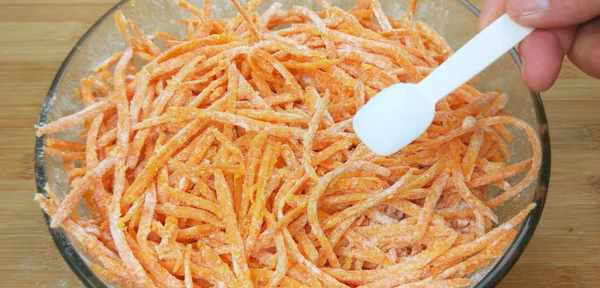 3、加入适量的面粉搅拌均匀,让每一根胡萝卜都裹上面粉