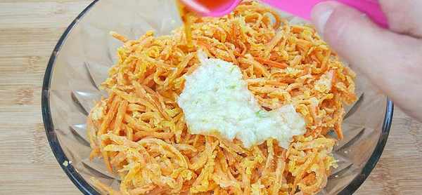 7、把蒸好的胡萝卜放入盆中,加适量的蒜泥,适量的香油