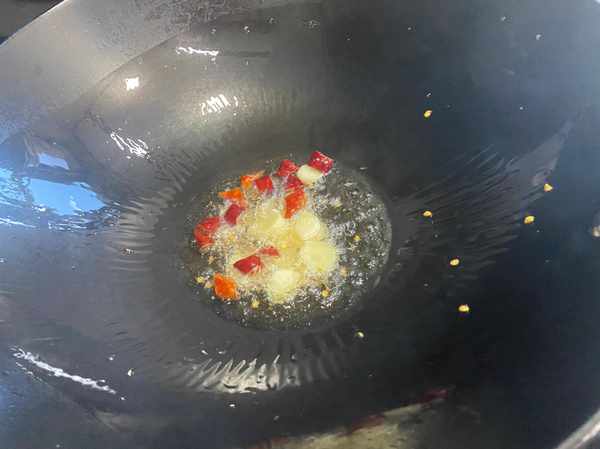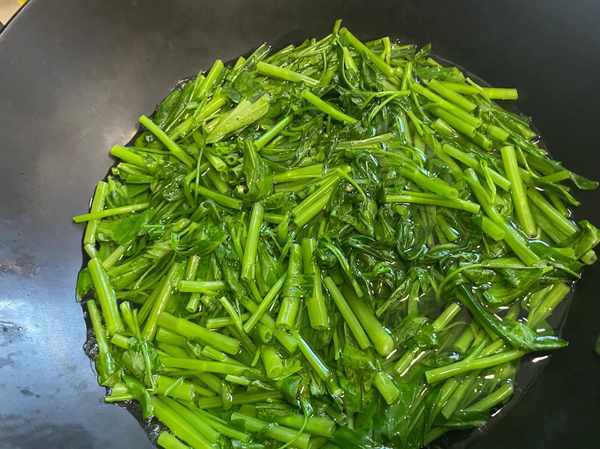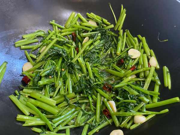 起锅烧油,放入蒜和辣椒煸炒出香味,然后放入焯水后的空心菜大火炝炒。