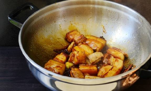 加入香料和五花肉继续翻炒上色,然后加入除味精之外的所有调料裹匀