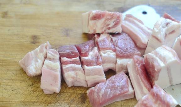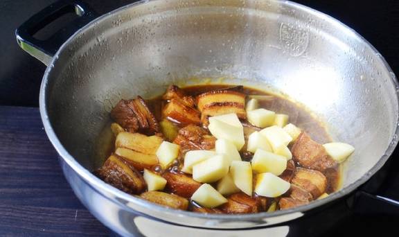 五花肉切大块、锅内放入冷水,将肉放入焯烫后洗净沥干,另外将土豆去皮切小块备用