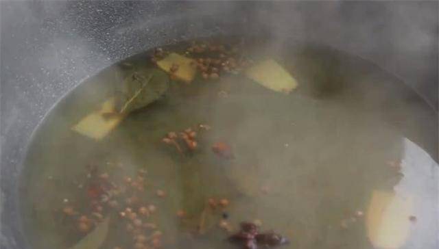 2.接着准备调料水,锅里加入少量水,然后加入花椒丸、八角、月桂叶、茴香、姜片,大火煮熟,转小火煮熟大约10分钟。调味水煮沸后,沥干水分,放在碗中冷却。