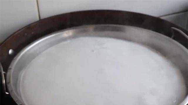 3、面团放好后,拌匀,取一勺面团倒入凉皮锣中摇匀,然后放入开水锅中。水的量要多,要用大火煮至锣底烧热。均匀后,摇匀里面的面糊,盖上锅盖,大火蒸1分钟左右。