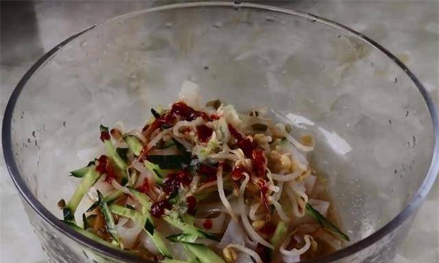 6、切好后盛入碗中,加入黄瓜丝、焯水豆芽、盐、调味水、香醋水、蒜头水,最后加入肥椒拌匀即可食用。