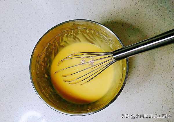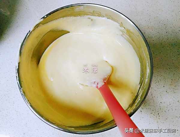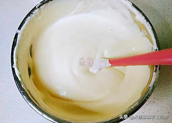 2.蛋黄糊和蛋白霜混合的时候,尽量快一点,防止蛋白消泡。最后蛋糕糊也不能太稀,有可能是消泡导致的过稀。