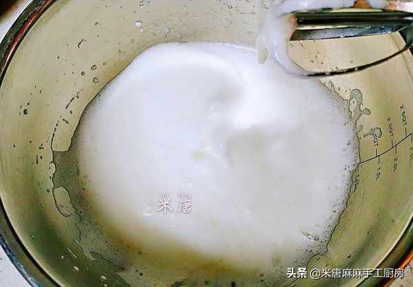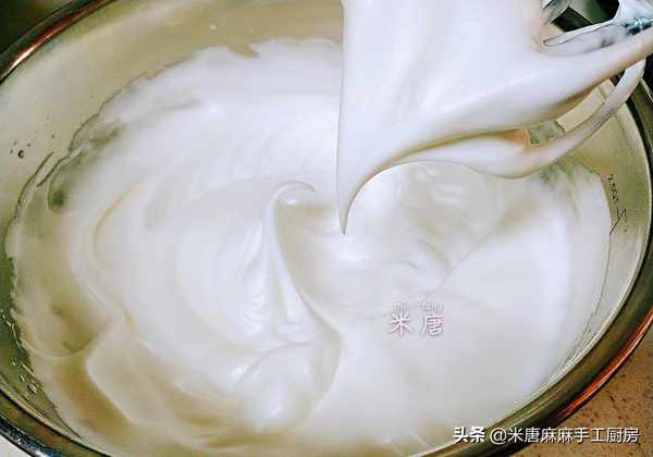 12.继续搅拌,打至湿性发泡的状态,出现弯钩。打过了,烘烤的时候容易开裂。