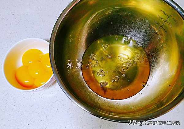 2.将鸡蛋的蛋清和蛋黄分开,分别放入无水无油的容器里。蛋清部分暂时不用,可放入冰箱冷藏。