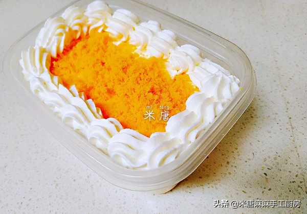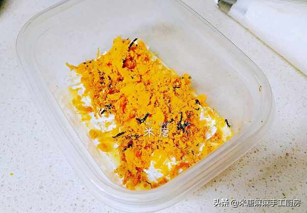 22.挤一层淡奶油,铺上适量咸蛋黄和肉松。