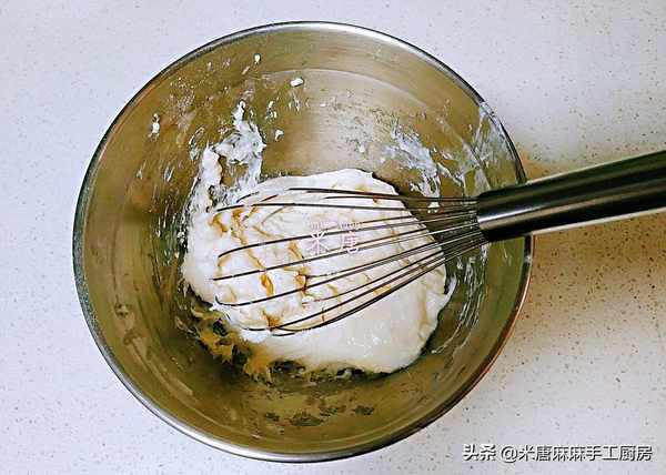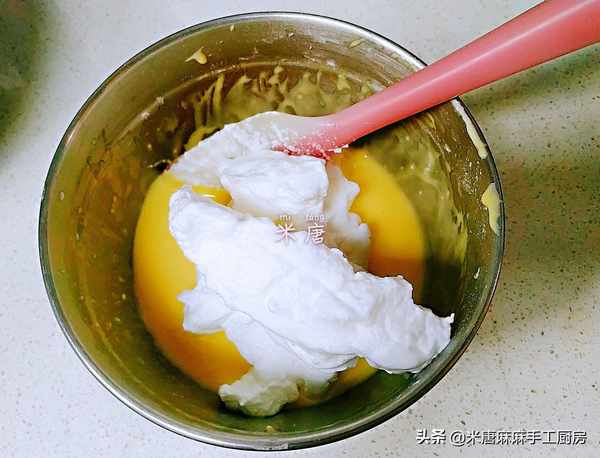 13.取1/3的蛋白霜加入蛋黄糊中,将其混匀。