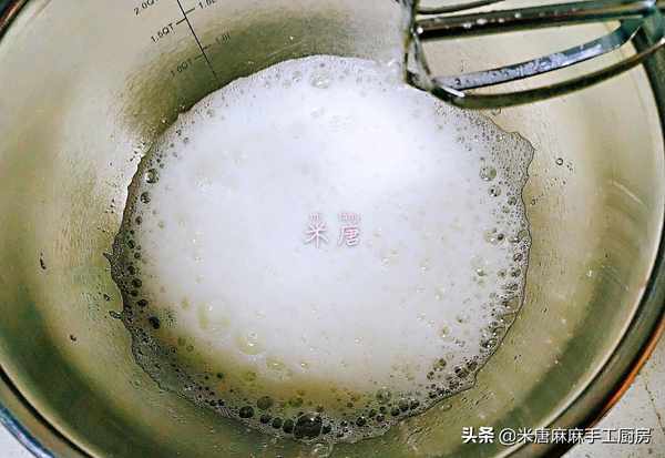 10.继续搅拌至小鱼泡眼状态,这个时候已经开始变细腻了,再加入1/3的糖。