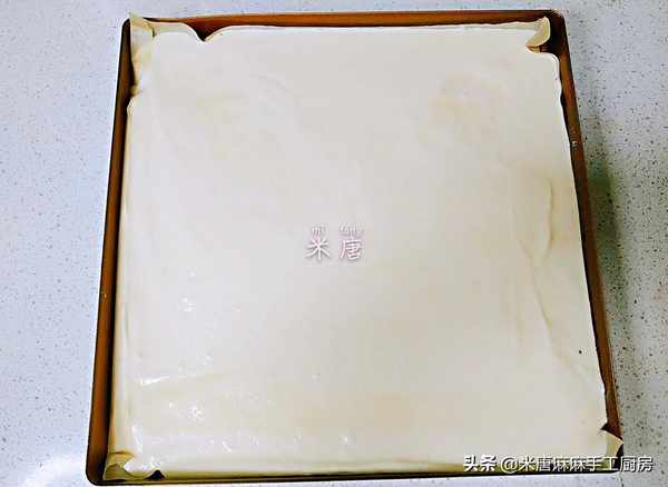 16.将蛋糕糊从距离烤盘上方30厘米左右处,倒入28*28的烤盘中,倒完之后可以用割面刀将表面抹平一点,再将烤盘在桌面上震几下,消除气泡。烤盘底部防油纸防粘。