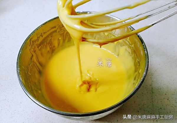 8.至面糊可以顺滑地滴落,在面糊表面可以形成纹路。蛋黄糊就做好了。