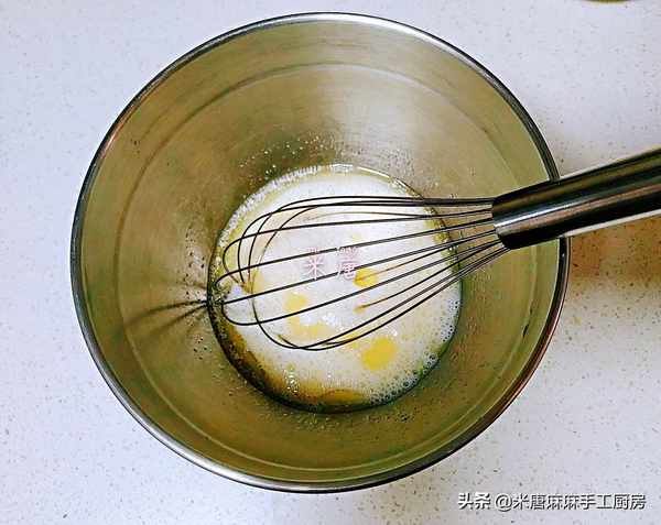 3.将牛奶(预留10-20克调整)、玉米油、糖(可不加)放在容器里,用蛋抽混匀至糖融化的乳化状态。