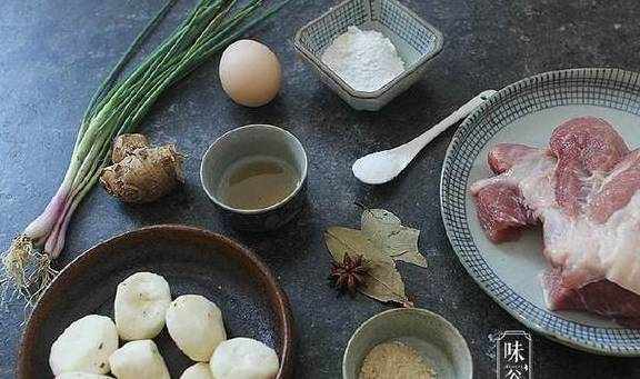 【材料】:猪腿肉300克、马蹄(荸荠)7个、鸡蛋1只、姜葱适量、淀粉4勺、盐1小匙、鸡粉1小匙、料酒1大勺、生抽2大勺、老抽2大勺、冰糖15克、大料1份、