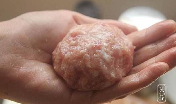 6、取适量肉馅放入左手手心中轻放入右手手心,左右手互换至其变成圆形;