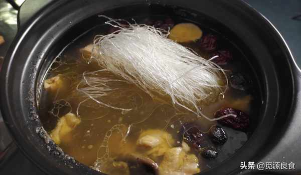 7、我媳妇喜欢吃细粉丝,加入适量的粉丝,煮熟之后,一锅鲜美的土鸡汤就做好了;
