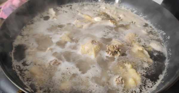4、之后给鸡肉焯水,温水下锅,放入3-5片切好的姜片和葱段,大火煮沸,撇清浮沫之后捞出,然后还需要在清水出反复冲洗,洗掉鸡块上附着的浮沫,这样炖好的鸡汤才会干净;