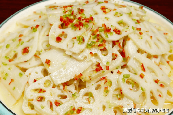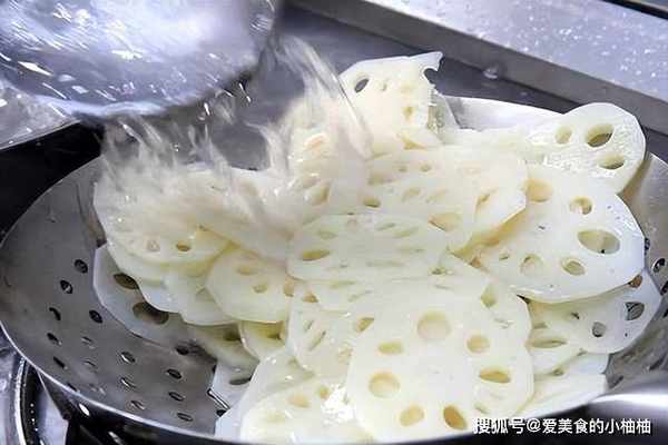 水烧开以后,把莲菜控水,放入锅中,焯水四十秒钟。等到莲菜焯熟,倒出控水,并用凉水快速冲凉,凉水快速冲凉可以使莲菜的口感更脆。