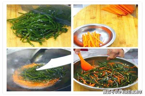 锅里烧水,水开后倒入胡萝卜丝和海带丝,焯水30秒钟立马捞出来,并快速用清水冲洗,海带丝焯水能减少腥味,清水冲洗胡萝卜丝吃起来口感会更脆。