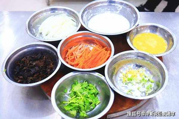 提前泡软的木耳,切成碎片,冬瓜去皮去瓤切成细丝;胡萝卜半根也切成丝;一根火腿、切成同样的细丝,另外切一点葱花和姜末;碗中打入2个鸡蛋,快速搅散成鸡蛋液;准备一个小盆放入一小勺淀粉和适量的面粉,加入适量的清水搅成细腻的面糊;再切一点香菜段备用。