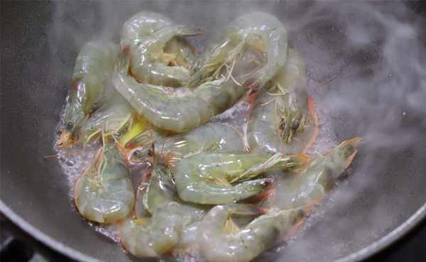 用这种方法虾必须是新鲜的。不新鲜的虾缺水,容易变褐。注意虾入锅后大概需要3-4分钟。一面变红后,立即“煮”另一面,以免虾肉过热。肉变得木质并失去弹性。