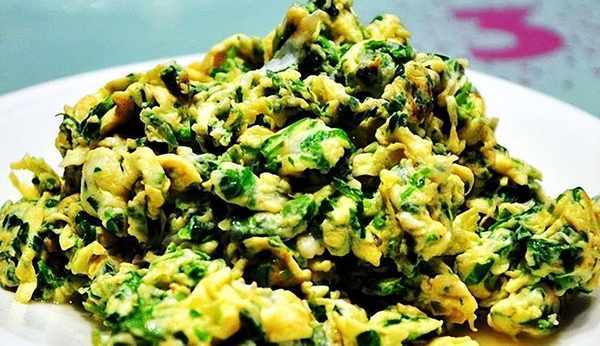 接下来,当锅里的油热时,将荠菜和汁倒入锅中,铺在鸡蛋饼上。底部定型后,用铲子将煎饼鸡蛋打碎,炸成小块,炸至金黄色。美味的荠菜炒鸡蛋就做好了。