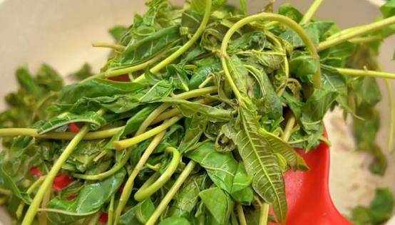 当时间到了,清除香椿。锅烧热,下香椿炒,香椿中的亚硝酸盐炒熟,香椿炒软,关火捞出。