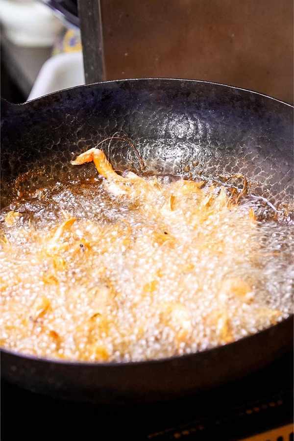 当油温达到40-50%时,加入沥干的虾。如果炸河虾的油温太高,河虾的表皮会烧焦,影响入味。