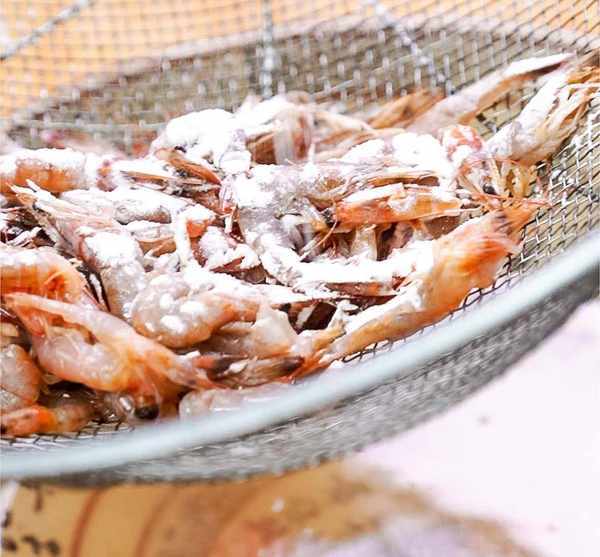 最后,将准备好的粘米粉均匀地撒在炸好的河虾上。这样,河虾香甜可口,越吃越甜。这是一道非常美味的菜。