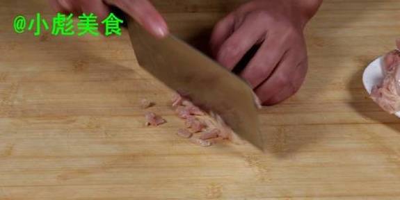 2、鸡脯肉切成末、全部切完、装入盘中。