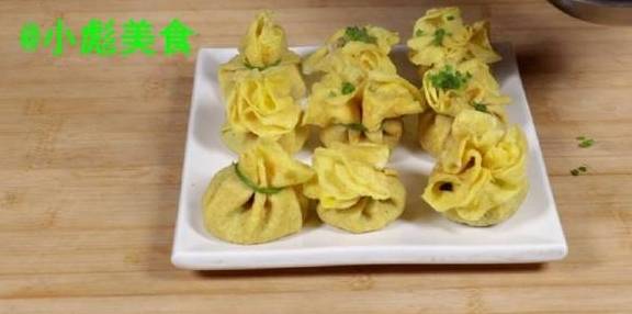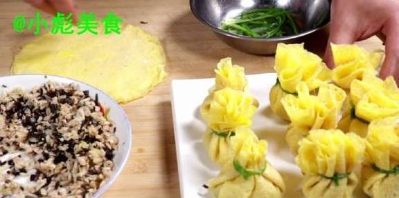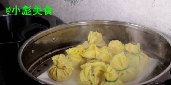 15、现在包成烧卖就可以、中间放少许馅提起来。