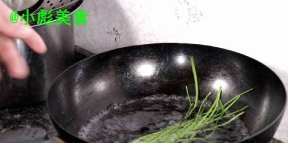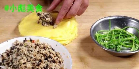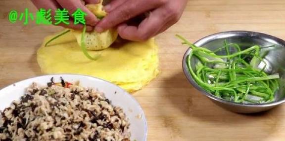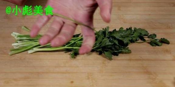 16、捏住、取一个香菜根、包住。