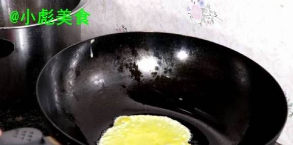 7、先开火、把锅烧干改成最小的火、刷点油来两勺蛋液。