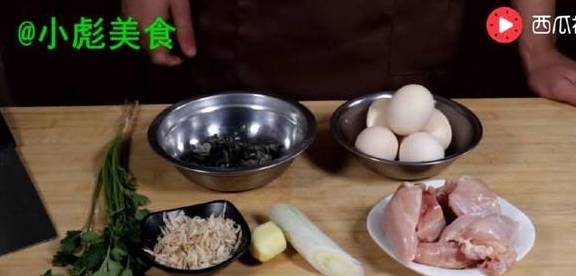 鸡脯肉、葱姜、小虾米、鸡蛋、木耳、香菜调料:盐、胡椒粉、油