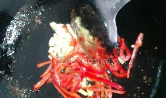 6.锅里放油放入姜,蒜末爆香锅,放入红椒略炒出辣味