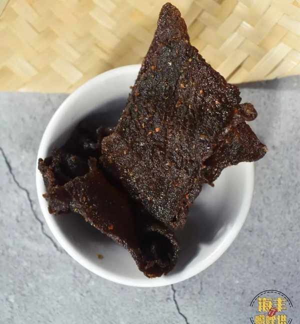 非常薄的片状牛肉干 每片大概2-3cm,辣椒籽带来了香辣味,十分诱人咬上一口,嚼劲十足,越吃越想吃。