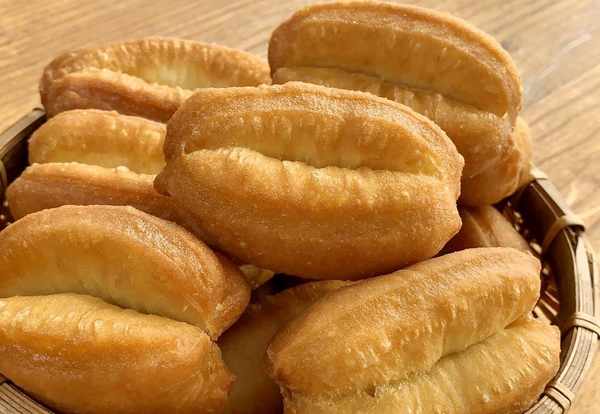 第二天早上拿出来,不用揉面直接抻长,擀成0.5厘米厚的片,下成大小相同的条,然后两条摞起来,用筷子压一下,再一分为二变成两个小油条,下锅炸到金黄即可。