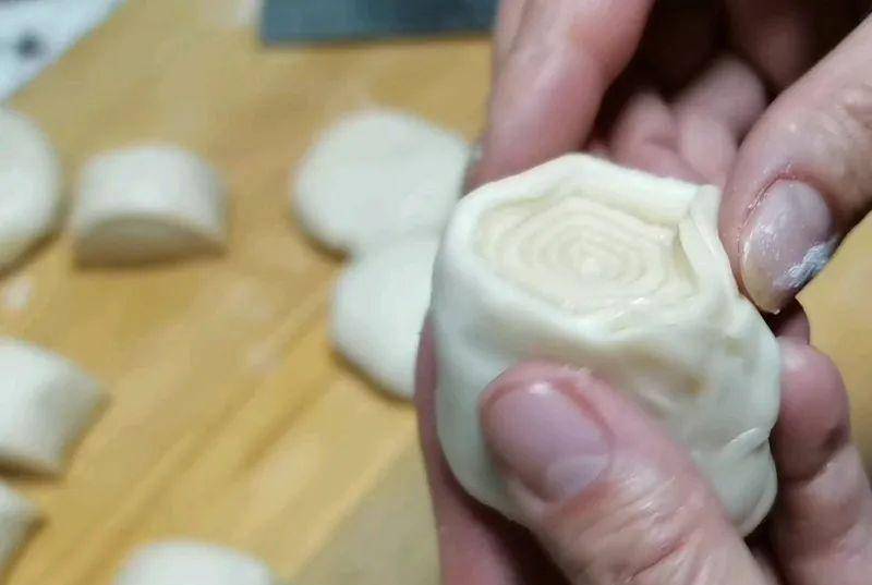 7、时间到了,把水油壳压大,把面团包在中间。