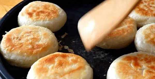 16.电烤盘抹油,把蛋糕壳放进去开始烤。温度不宜过高。大约2-3分钟后,煎一面,然后翻过来煎大约2-3分钟。弹出来时,四周没有生面团,两面金黄酥脆。