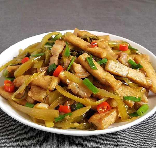 豆腐皮买好后,切成细条,水开一分钟捞出,锅里放一些五花肉,油炸好后,放一些蚝油生抽,再加入一大勺开水,并稍放一勺盐,少许鸡精和味精,然后将豆腐皮放入锅中煮3分钟。吃得长高,赶紧行动起来。