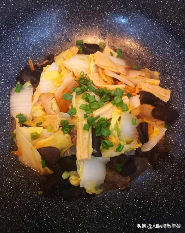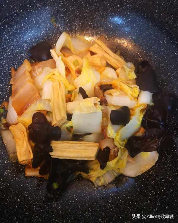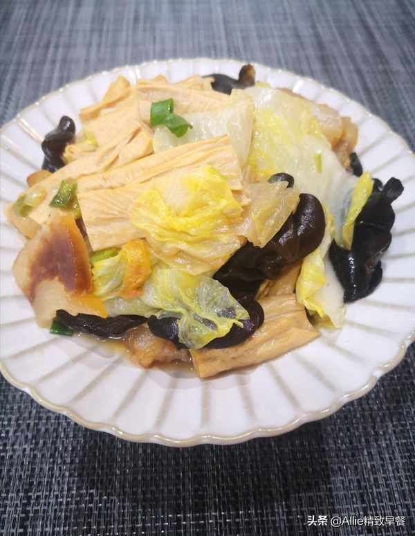 大白菜、腊肉、腐竹、木耳、大葱。调料:油、酱油。【实践】木耳和腐竹泡好后,清洗干净。水烧开后,将腐竹和木耳倒入锅中煮一分钟,捞出沥水。黑木耳要迅速放入冷水中。木耳受热膨胀收缩,可以使木耳的口感更加酥脆。