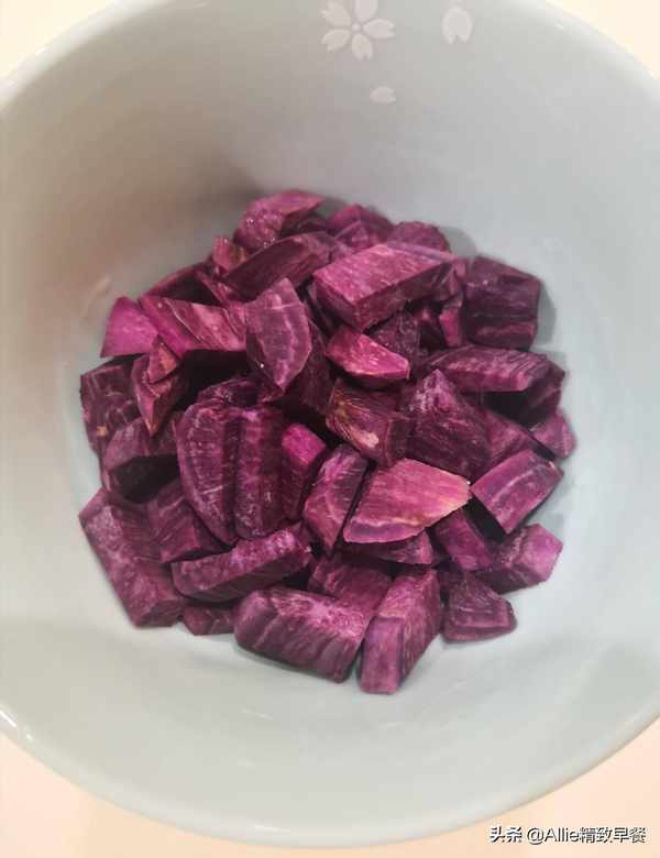 紫薯、芹菜叶、大米、糯米粉、大葱。调料:无。【实践】将紫薯洗净,切成小块。