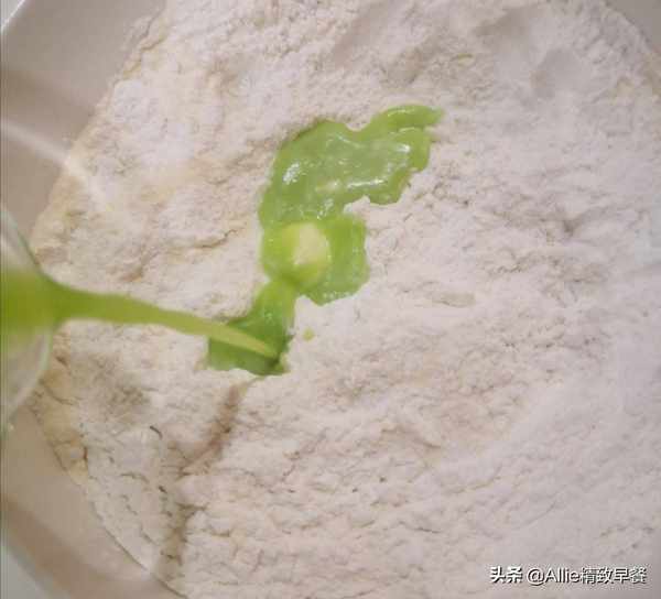 让我们开始用芹菜汁做年糕吧。方法是一样的。平时不想吃的芹菜叶或其他绿叶蔬菜。如果喜欢深色,可以多加一些绿叶蔬菜。热水适量,用榨汁机打汁,再过滤一遍,会更细腻,更好看,更好??吃。一边搅拌面粉一边倒入芹菜汁。