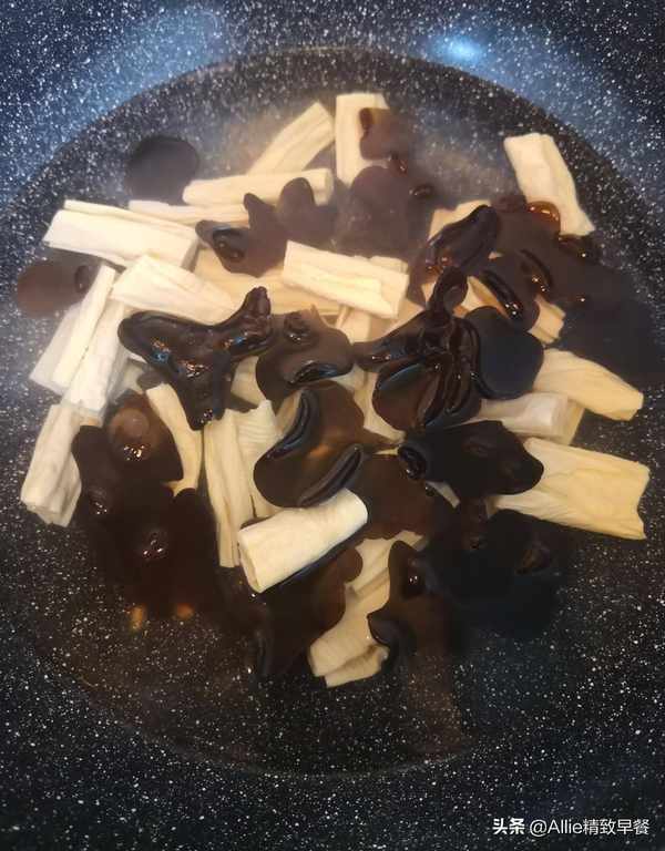 倒入木耳和腐竹,加入适量生抽提鲜,翻炒几下。因为腊肉和生抽有咸味,所以没有加盐,少盐更健康。