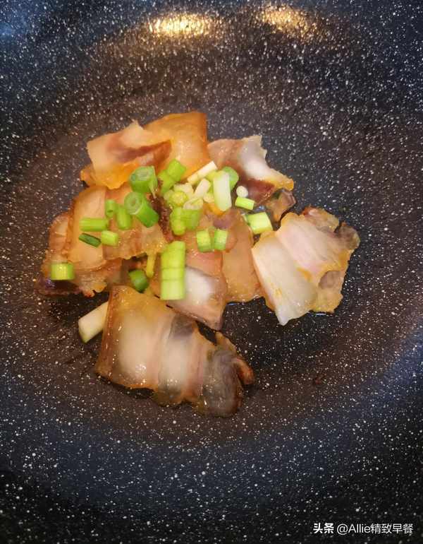 热锅冷油,少许油,倒入腊肉,炒至出油,倒入葱圈炒香。