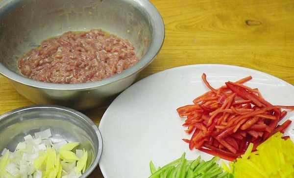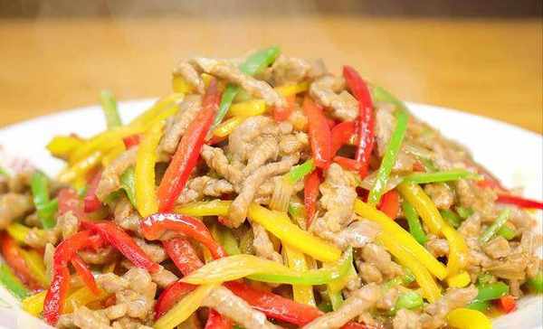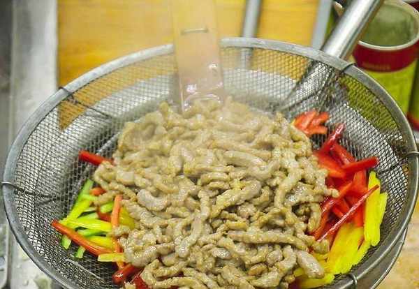 2.锅里烧宽油,油温升至四成热时,把肉丝倒进去并快速搅散,20秒后一变白,立马起锅。趁着热油,把辣椒丝也激一下。