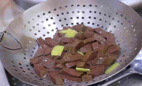 2.锅内烧水,冷水放入鸭血和姜片,倒入一点料酒去腥,大火烧开以后再煮1分钟,把鸭血倒出来,挑出里面的姜片,用清水冲洗干净。